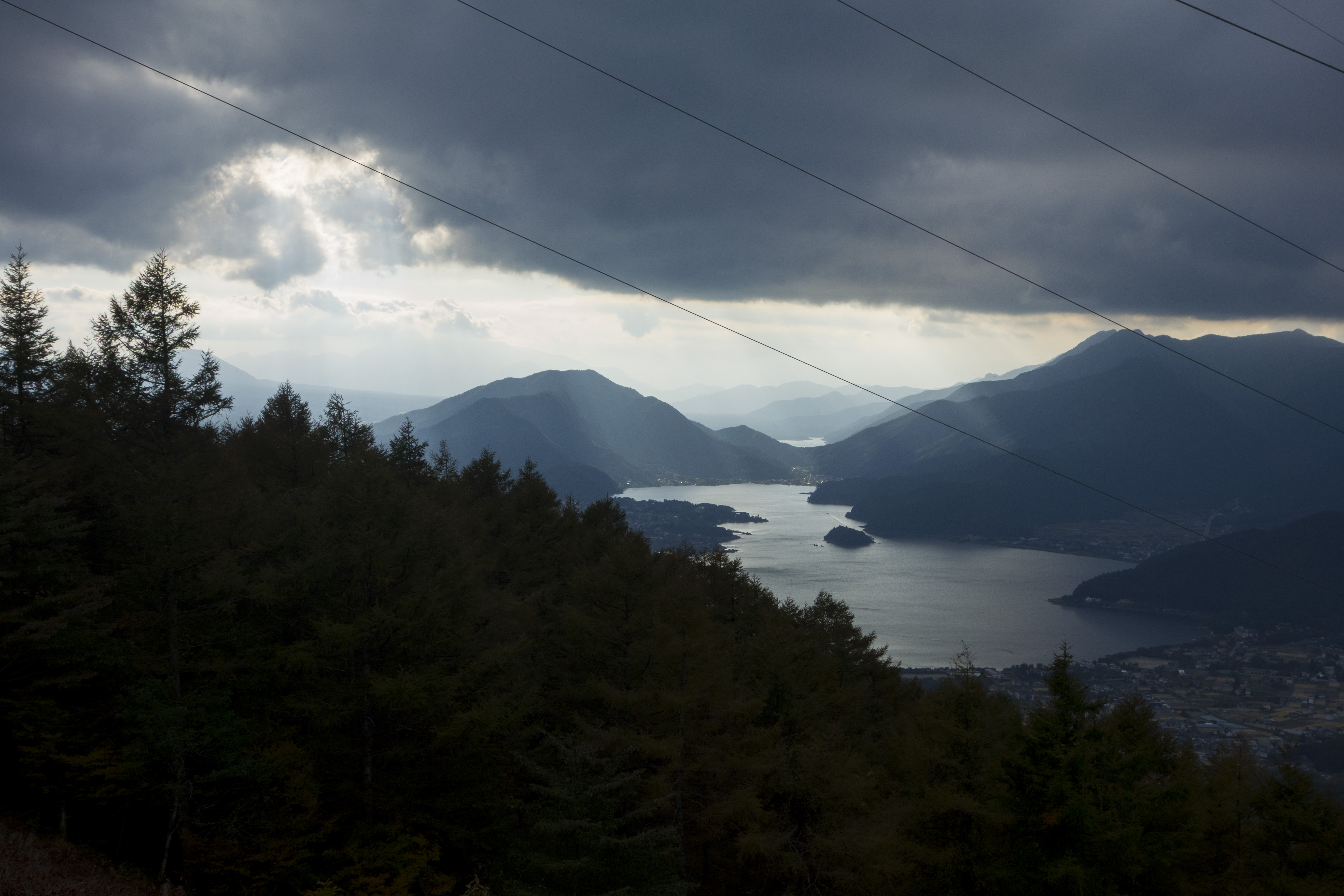 La descente se fait de préférence par un autre chemin, le long de la crête, pour admirer tout le long un panorama déjà sympathique par temps couvert, et sûrement exceptionnel par temps dégagé, avec le mont Fuji à gauche et le lac Kawaguchi à droite.