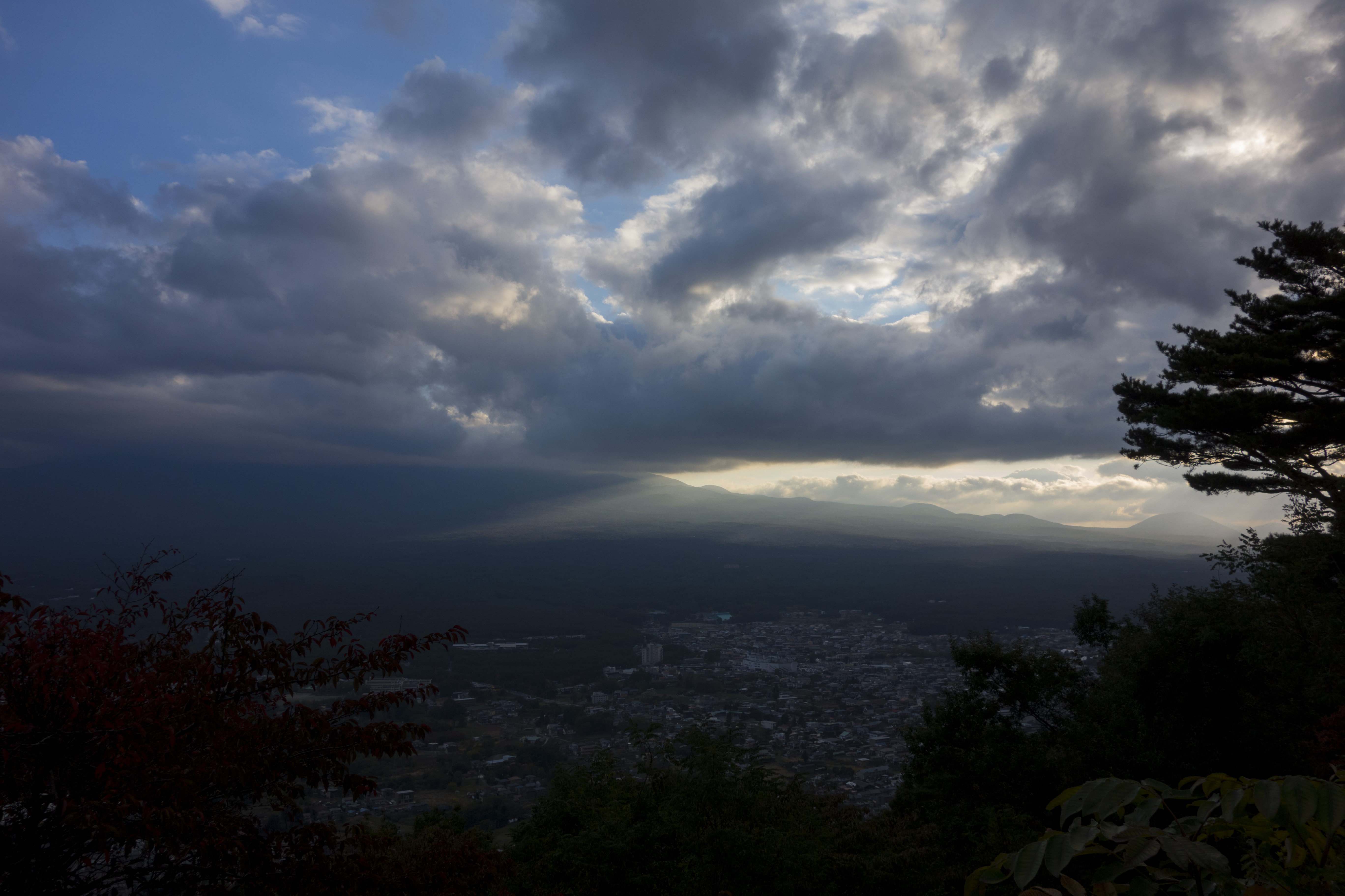 Las, de cela, point pour nous ! Le sommet du Fuji devait rester obstinément nuageux, se révélant seulement parfois à travers une déchirure. Cependant, les masses cotonneuses restant accrochées au sommet, la simple vision de l’étendue de ses pentes, avec le parc d’attraction Fujikyu Highlands à ses pieds, était déjà impressionnantes.