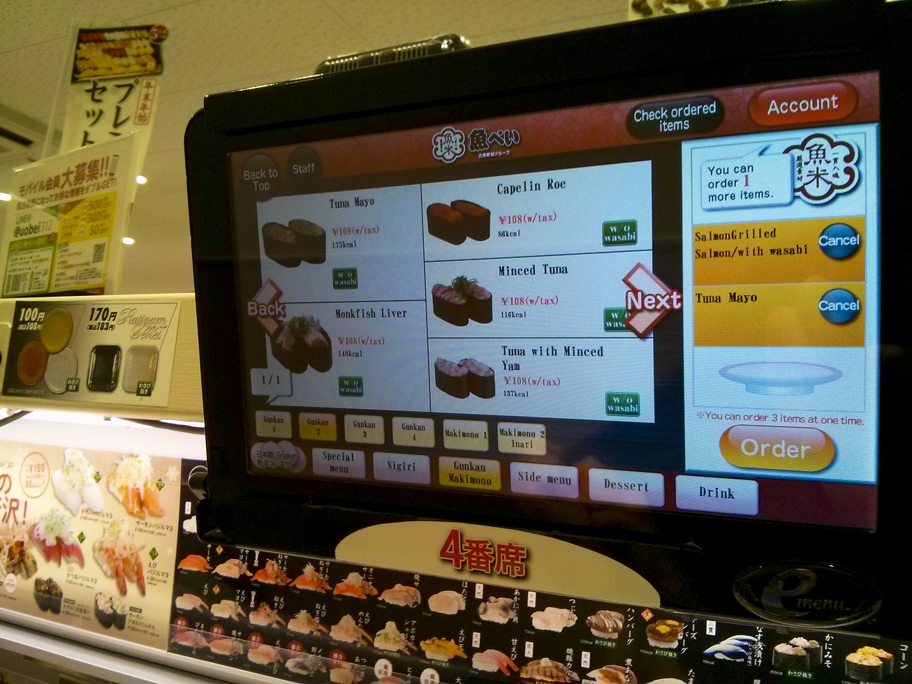 Commande par écran tactile de sushis classiques ou spéciaux (sushi steak haché testé pour la forme, pas vraiment approuvé). Lire la suite