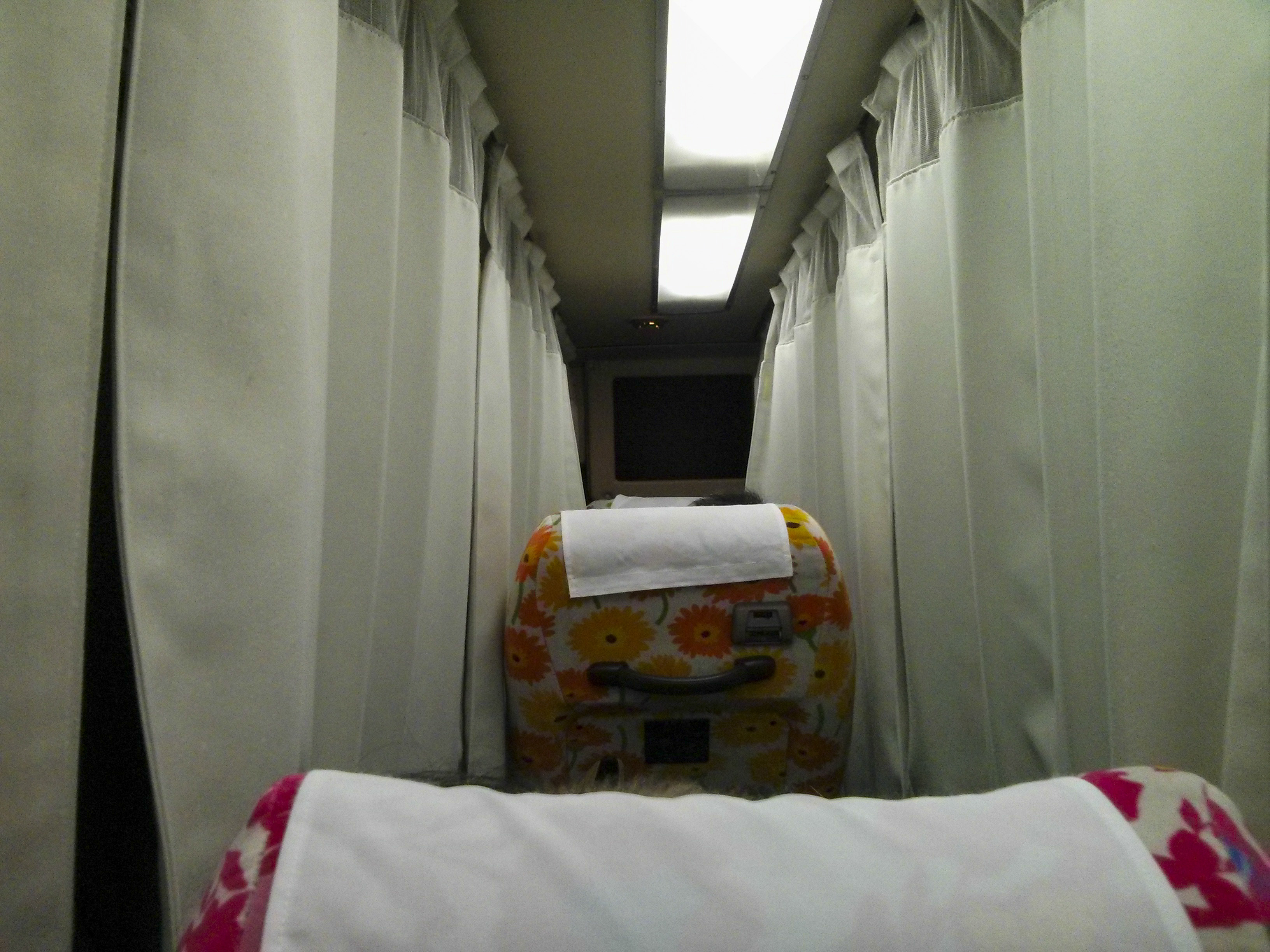 Huit heures d’un sommeil agité dans une espèce de clapier à lapin roulant rappelant vaguement un magicobus au rabais (lisez Harry Potter) plus tard, je dois avouer que mon opinion a changé et que la prochaine fois, je réfléchirai à taper dans mes économies pour prendre le Shinkansen (voire un package comprenant train + hôtel, faut que je creuse le truc).