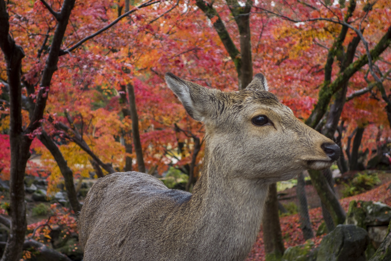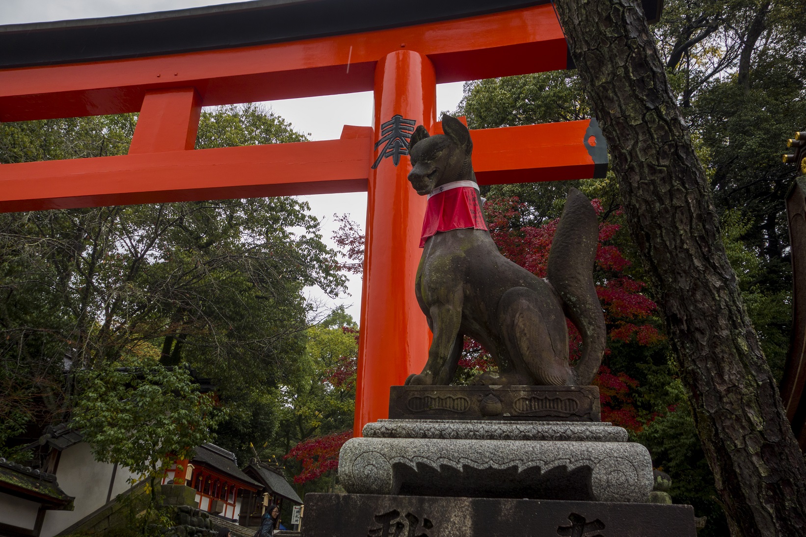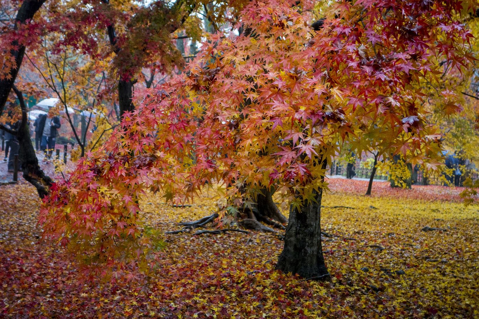 Nos pas nous portèrent donc d’abord vers le Tofukuji, temple bouddhiste, et principalement son jardin : orgie de feuilles rouges, sur les érables et tapissant le sol, sous une pluie fine qui fait ressortir de manière encore plus intense les couleurs des feuilles couvertes d’une fine pellicule d’eau.