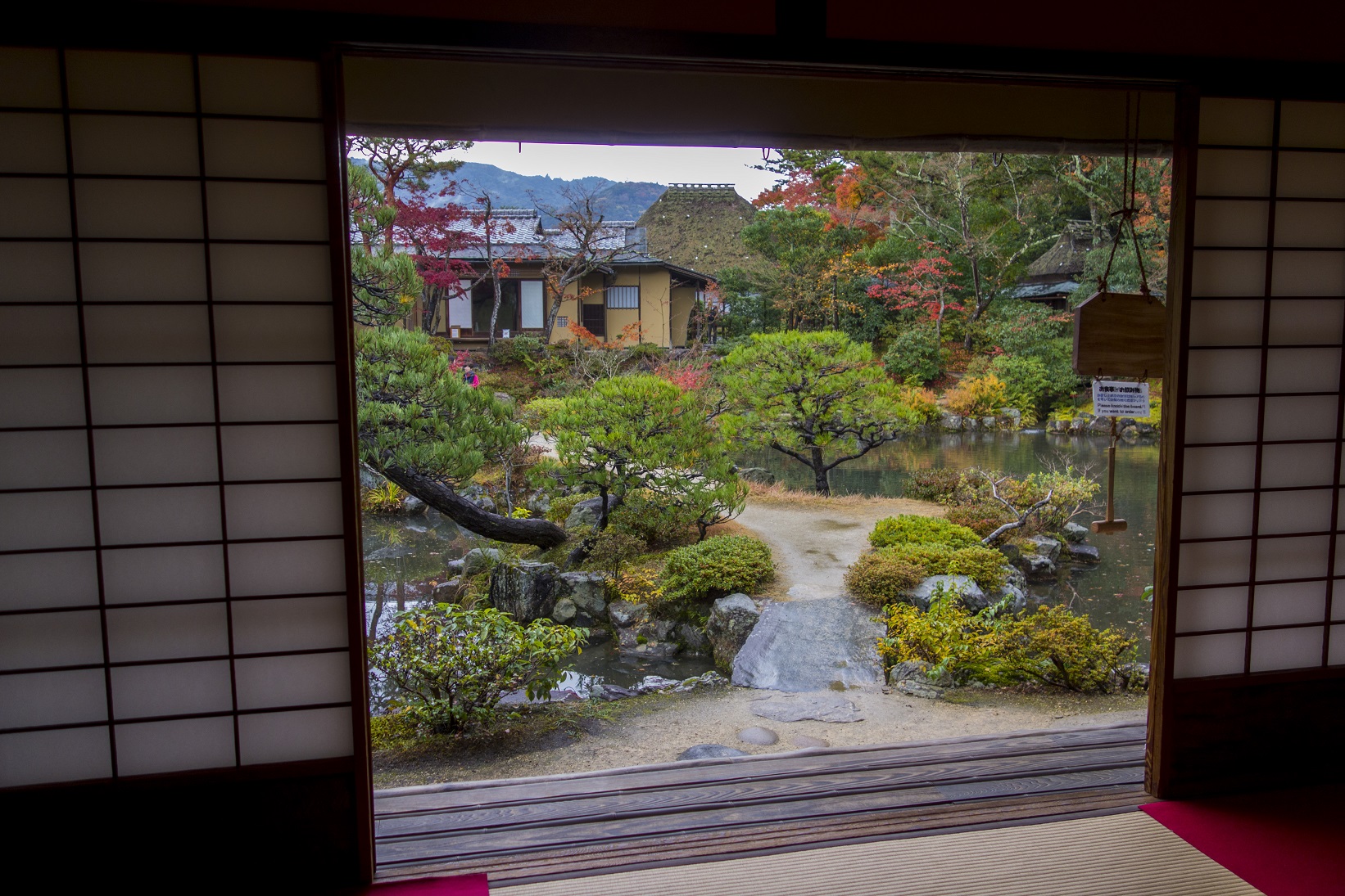 Nous avions en effet jeté notre dévolu sur un hébergement excentré, à 40 minutes de train de la gare de Kyoto, mais au nord cette fois-ci. Trouvé sur airbnb, un petit appartement nous avait en effet immédiatement séduits malgré la distance, car il vantait sa localisation au bord d’un lac et dans une résidence avec onsen (bain thermal) au dernier étage. Je conseille ardemment airbnb, site sur lequel on peut faire des affaires absolument fantastiques, en tout cas selon ma très faible expérience. Car c’était ma première location par ce biais, et je dois avouer que je me suis raté quelque part dans la localisation GPS de l’appartement et avais considéré un taxi comme inutile pour 20 minutes de marche (je m’aperçois que cette excursion n’est pas très flatteuse pour mes compétences organisationnelles). Cette erreur résulta donc en une longue errance nocturne dans des zones peu flatteuses et même carrément flippantes par endroits. Nous constaterions le lendemain que les lieux étaient en fait très agréables, mais dans le noir complet, perdus au bord d’un lac, la batterie de mon téléphone (et donc le gps) menaçant de lâcher à tout moment… c’était pas la même histoire. Je préfère ne pas repenser au moment où je croyais avoir trouvé la bonne route, mais où un coup de lampe torche devait révéler un cul de sac et, derrière un petit portillon grinçant, une maison aux airs de vieux cabanon de sorcière… brrrr.