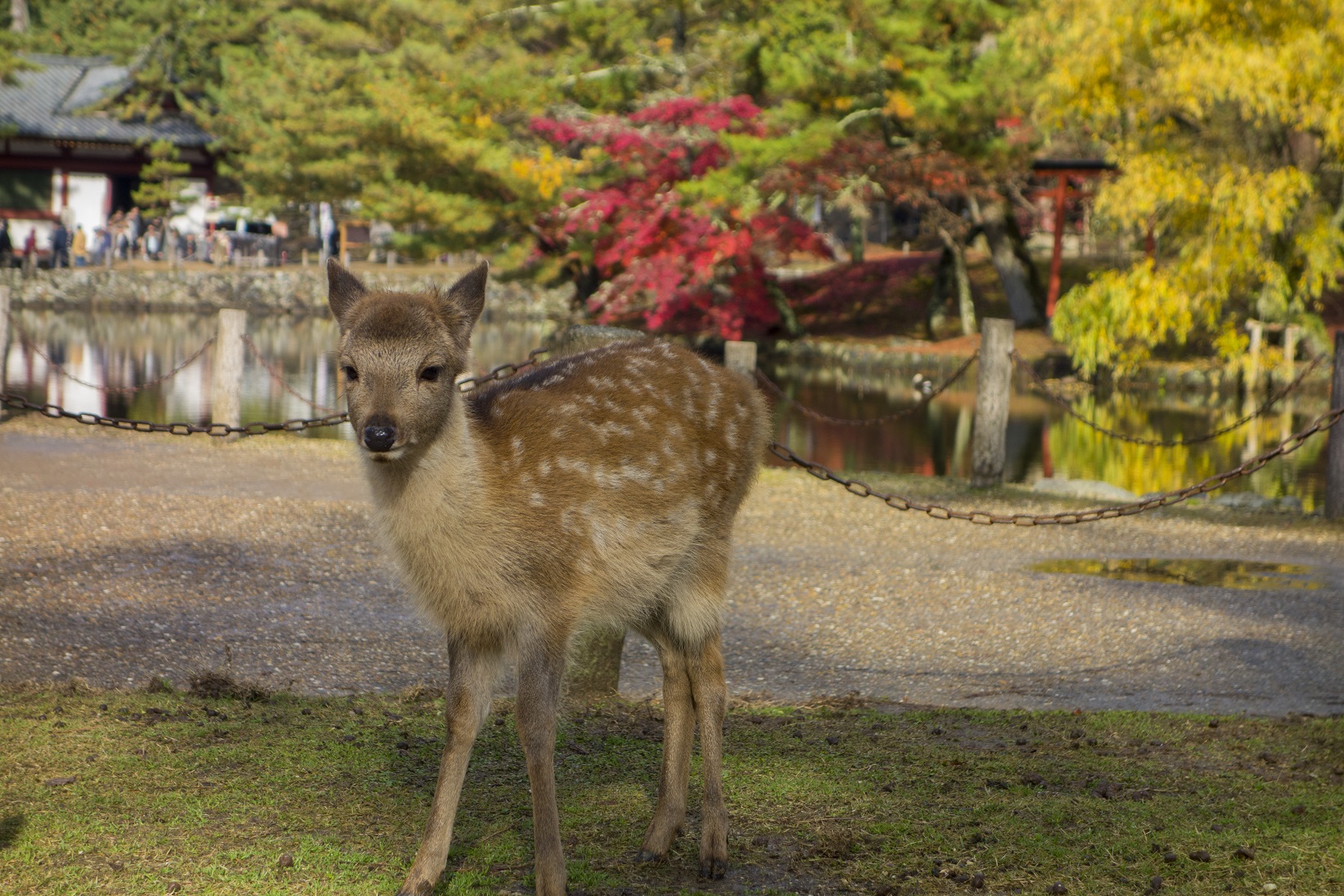 De là, donc, le train, Nara, capitale du Japon au VIIIe siècle, avec les vestiges de sa grandeur, dont son grand bouddha et bien sûr ses inévitables daims ! Une demi-journée ne suffit pas à tout voir, nous nous sommes donc focalisés sur le grand bouddha et le plus beau jardin zen de la ville (Isuien), flânant dans le parc entre les visites, le temps s’étant dégagé. Nous avons aussi déjeuné dans un petit restaurant traditionnel offrant une vue sur le jardin sus-cité. Le rapport qualité-prix n’est pas génial en ce qui concerne la nourriture, mais l’atmosphère générale du lieu fait tout son intérêt.