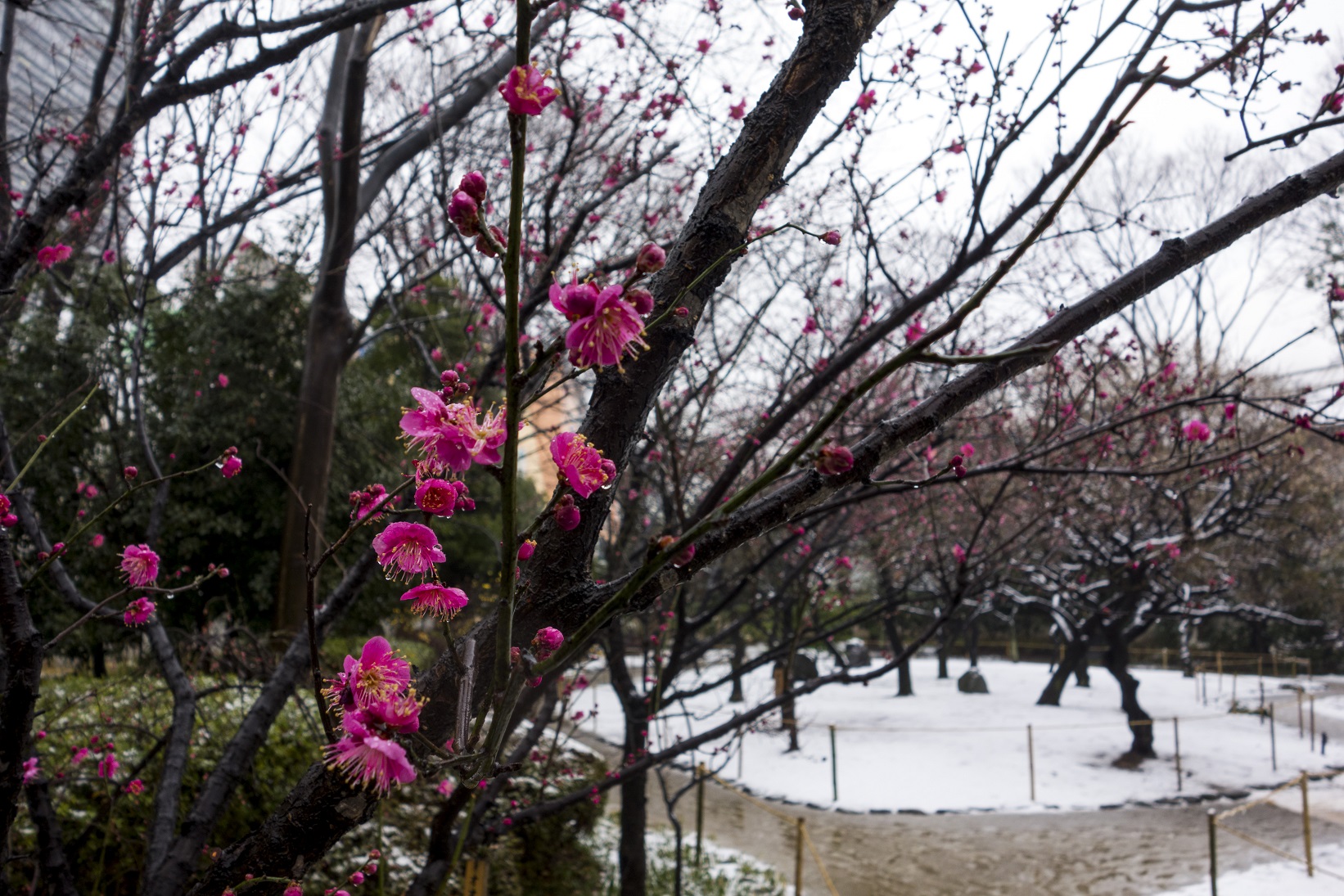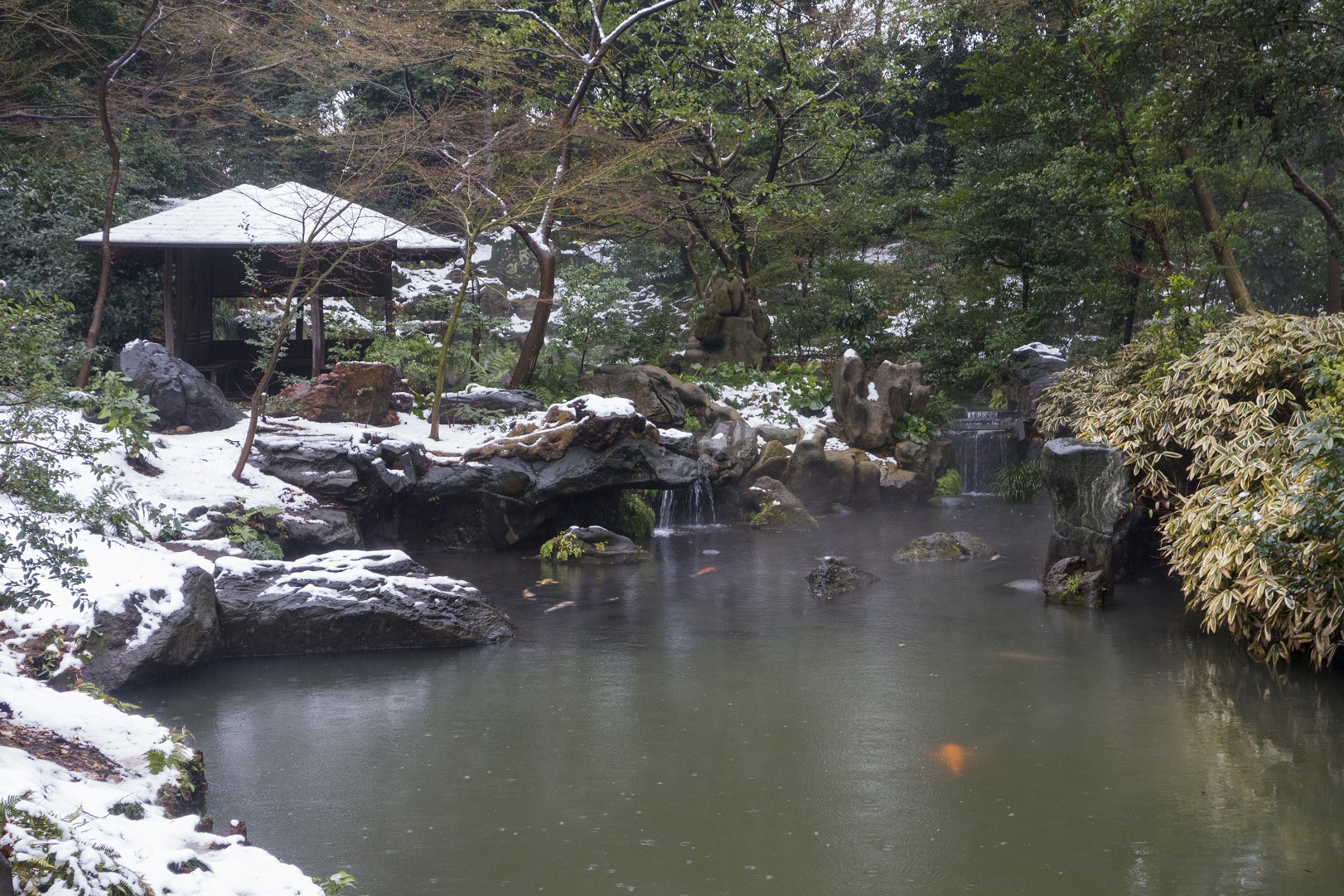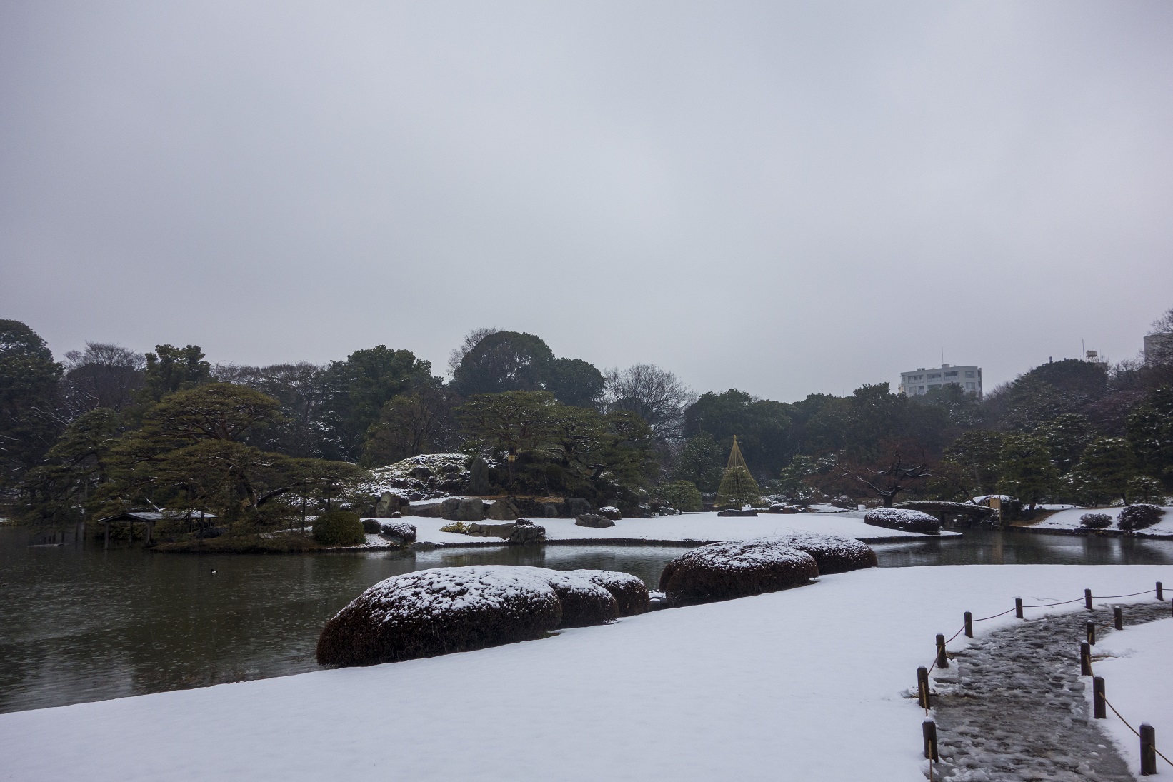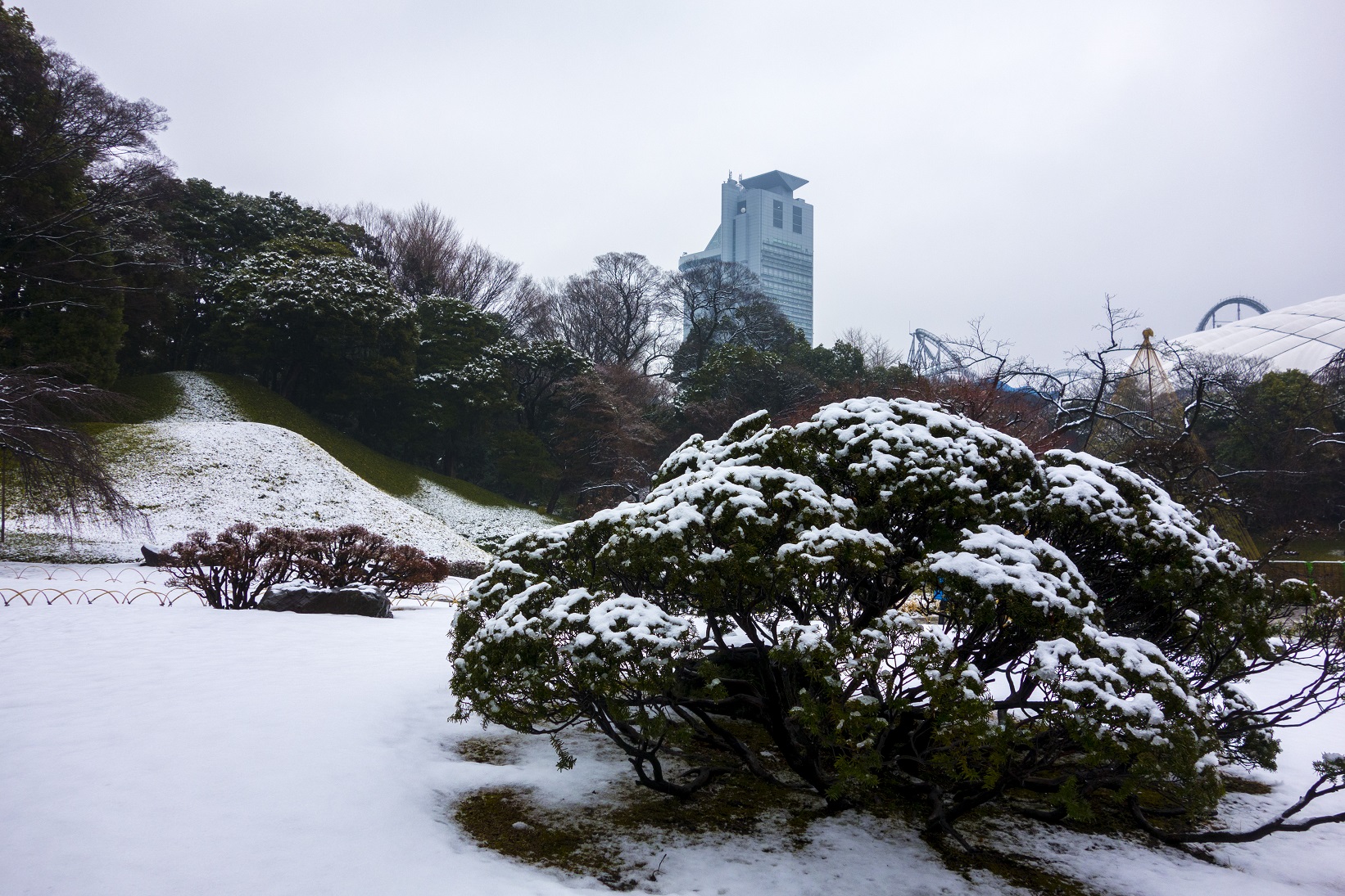 Je me suis donc précipité dans le métro, avec pour objectif deux jardins japonais de la partie nord du centre de Tokyo : le Koishikawa Korakuen d’abord, puis, à trois stations de métro, le Rikugien. Ces deux jardins créés au cours du shogunat Tokugawa (donc entre le XVIIe et le XIXe siècle) sont considérés comme les deux meilleurs exemples de l’art du jardin japonais à Tokyo. Ayant eu la flemme, après nos nombreuses excursions d’automne, d’effectuer des sorties « feuilles rouges » à Tokyo, je ne voulais pas rater cette occasion rare de capturer la magie de la neige en pleine ville.