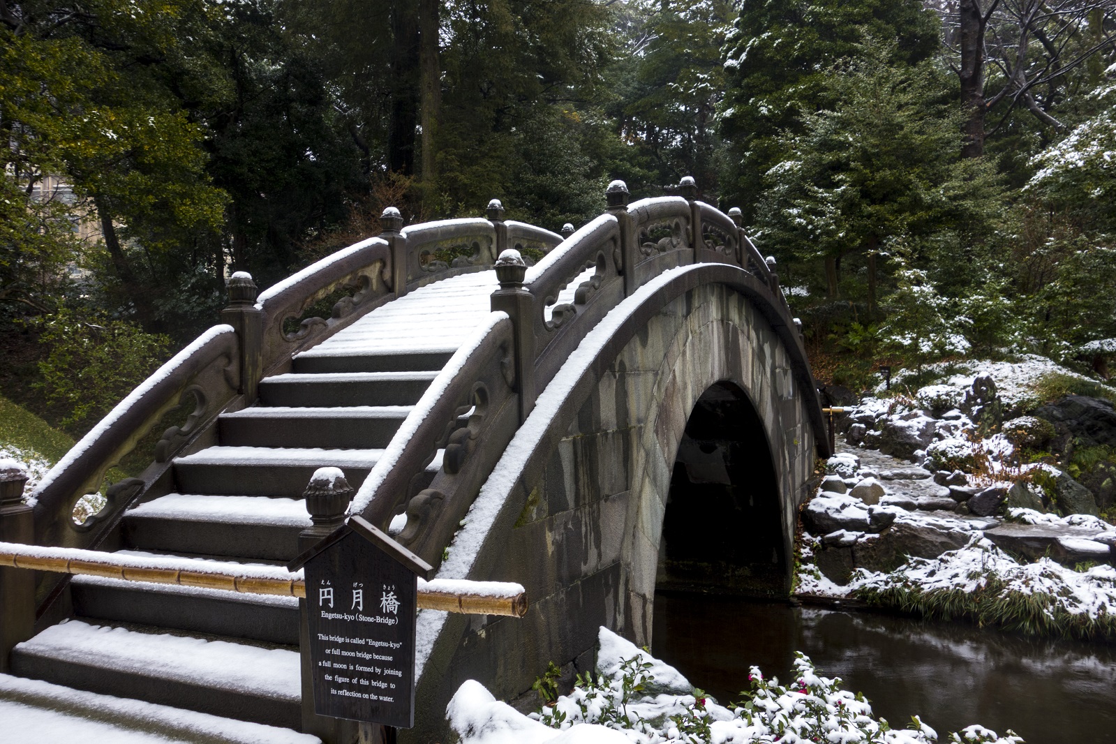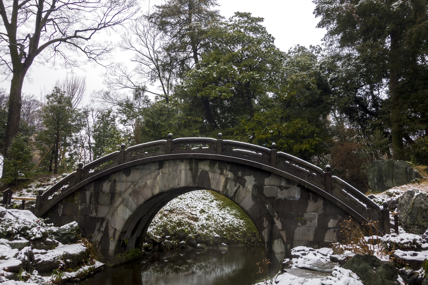 La neige apporte une atmosphère vraiment exceptionnelle aux lieux, surtout en l’absence de tout autre visiteur. En témoigne ce pont admirable d’harmonie, appelé « pont de la pleine lune » en raison du cercle parfait formé par l’arche et son reflet. (Spectacle que je n’ai pas pu photographier en raison d’un recul insuffisant dû à des travaux pile au mauvais endroit. Mais croyez-moi sur parole, ça rend bien.)