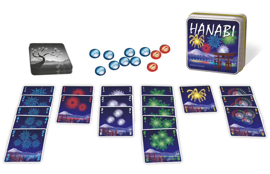 Il s’agit d’un jeu de cartes dans lequel chaque carte représente une « étape » d’un feu d’artifice (« hanabi » en japonais). Les joueurs doivent abattre les cartes dans le bon ordre pour tenter de constituer des feux d’artifices complets. Ça paraît basique, mais l’originalité du jeu vient de deux éléments atypiques : les joueurs ne s’opposent pas mais coopèrent, et chaque joueur tient ses cartes face vers l’extérieur, chacun connaît donc les jeux de tout le monde sauf le sien ! Heureusement, quelques indices bien précis sont autorisés, et c’est à partir de ceux-ci que les joueurs doivent tenter de comprendre laquelle de leurs carte ils doivent abattre. Mais les indices sont limités, il faut donc faire preuve du plus de logique possible pour parvenir à constituer un beau feu d’artifice. On se retrouve à angoisser quand le joueur dont c’est le tour semble hésiter à prendre la mauvaise carte, tout en essayant de ne pas le montrer (puisque ça s’apparenterait à de la triche), bref, c’est très marrant.